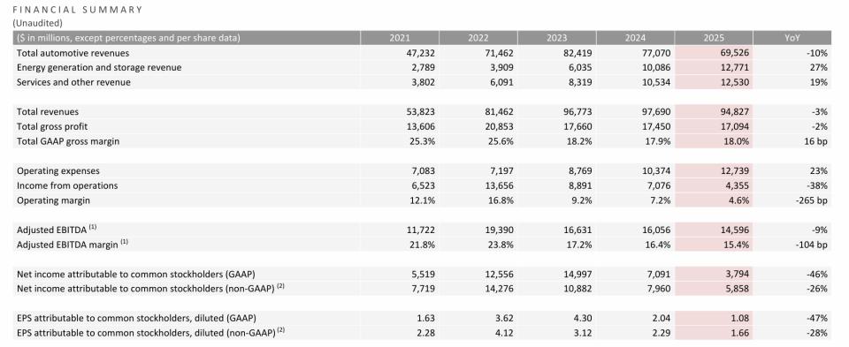 更值得关注的是全年表现:特斯拉2025年总营收948亿美元,同比下降3%,这是公司历史上首次出现年度营收下滑。全年汽车交付量同比下降8.6%至164万辆,持续多年的增长纪录就此终结。
