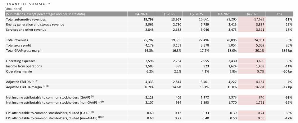 特斯拉2025年第四季度业绩