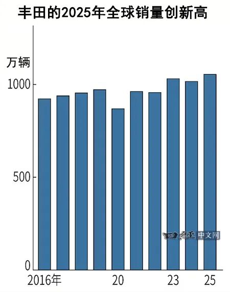 丰田1月29日公布的数据显示,2025年全球销量(包括雷克萨斯)同比增长4%,达到1053万6807辆,创出历史新高。混合动力车(HV)在美国等地表现坚挺。包括大发工业、日野汽车在内的集团全球销量也增长5%,达到1132万2575辆,创历史新高。超过德国大众集团的898万辆,连续6年世界第一。