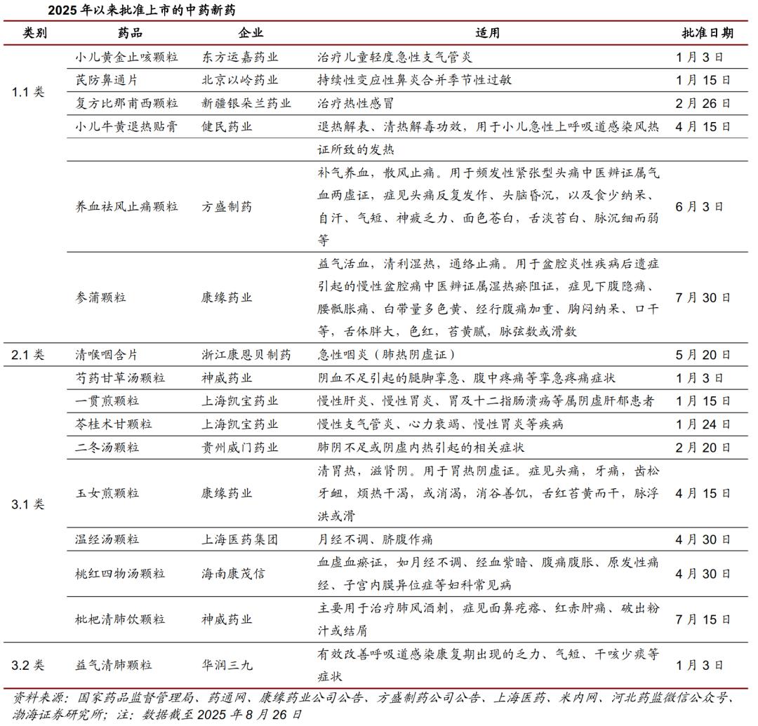 以批准文号计算,2020-2024年我国累计获批上市中药新药分别达到3、12、7、8、12个,2022-2024年明显加速。进入2025年,截至2025年8月26日已获批上市中药新药16个,其中中药创新药6个、中药改良型新药1个、古代经典名方中药复方制剂9个,2025年数量已多于2024年全年。中药企业加快创新步伐,CDE审评速度进一步提升,形成正向循环。