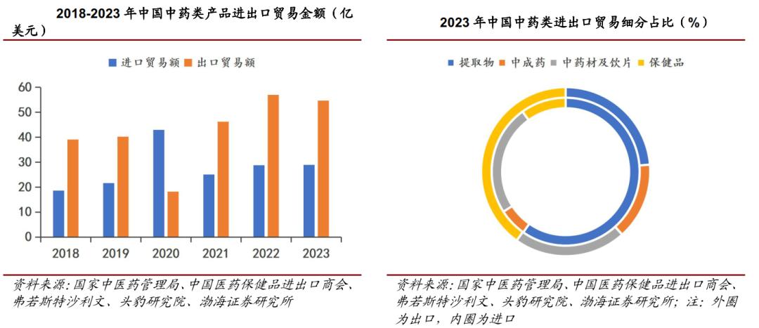 从现实数据看,中药“出海”已不再停留在政策层面。2018—2023年间,我国中药类产品进出口规模虽有波动,但整体需求保持稳定增长。2023年,中药类产品进口额达28.9亿美元,出口额达54.6亿美元,国际市场对中医药的接受度持续提升。从结构上看,中药提取物在进口中占比接近六成,而出口端则以保健品和中药材、饮片为主,显示中药产品正以更易被国际市场接受的形态加速外延。