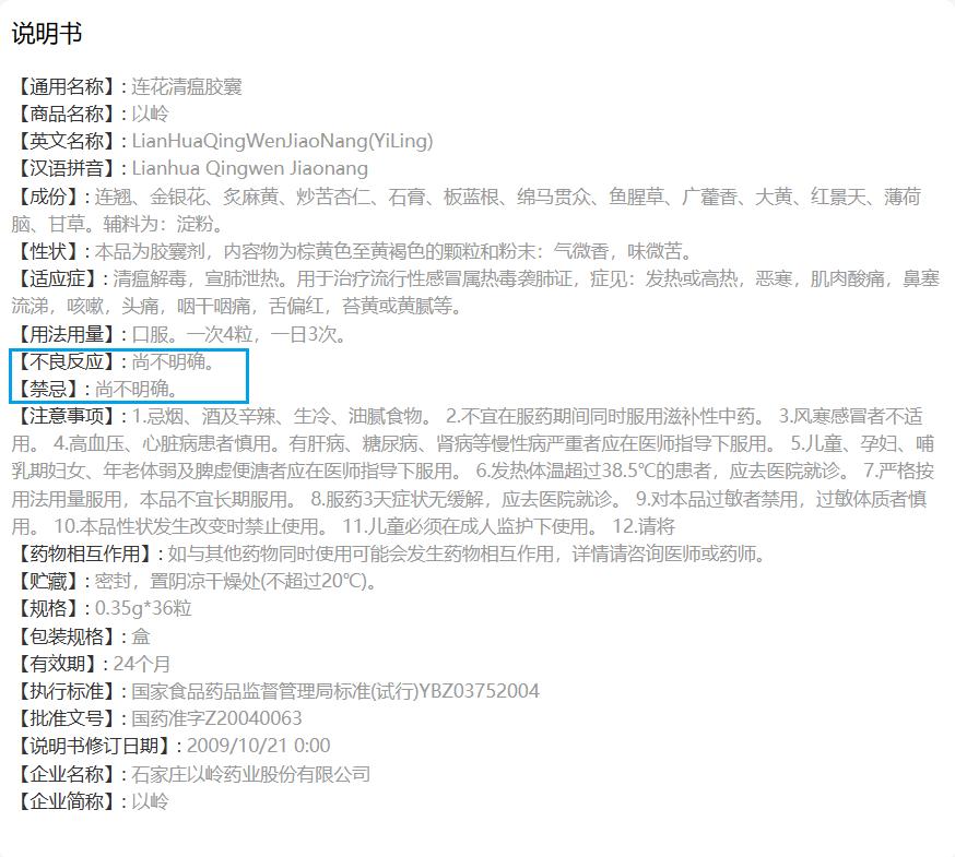 作为以岭药业过去5年的核心品种,连花清瘟胶囊的公开说明书中,【禁忌】【不良反应】两项仍标注“尚不明确”。