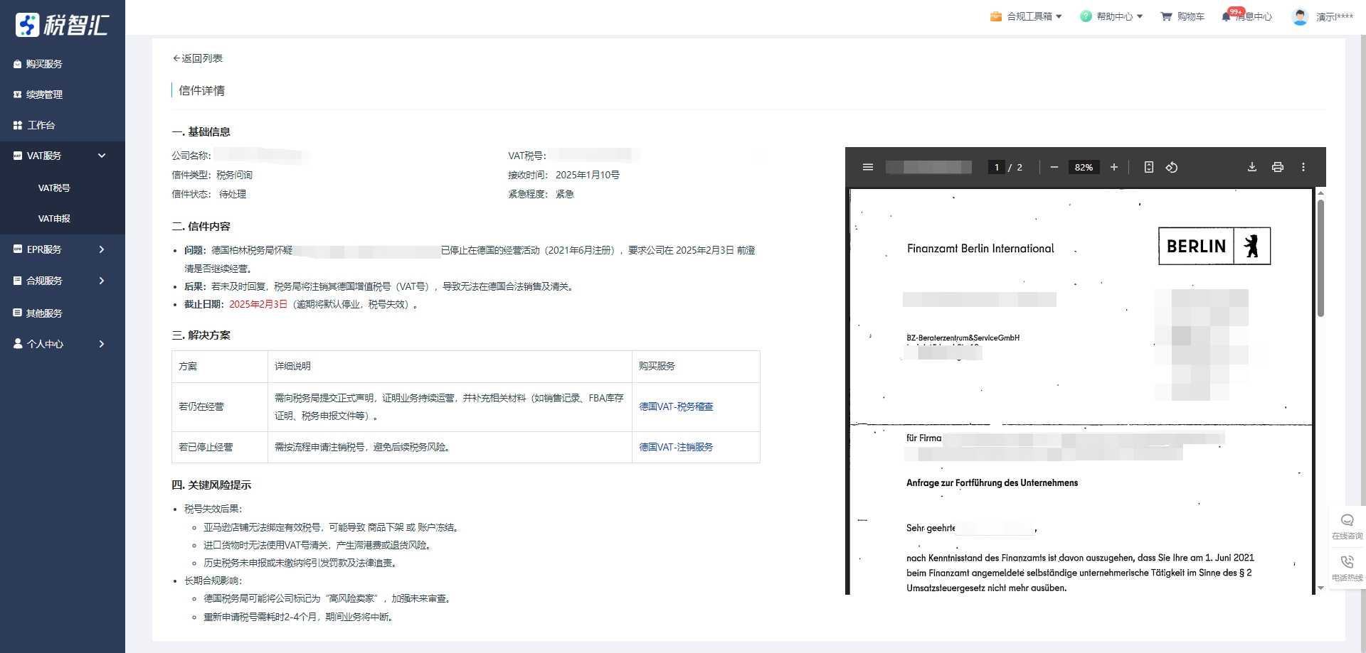 尤为关键的是,其系统基于服务超10万出海企业的经验积累,构建了覆盖全球200多个市场的税务合规知识图谱,在VAT计算、EPR分类等专业领域展现出显著优势。平台提供7×24小时税号状态AI监测,实现异常秒级预警,并联动专家快速响应,将企业管理模式从被动补救转向主动防控。