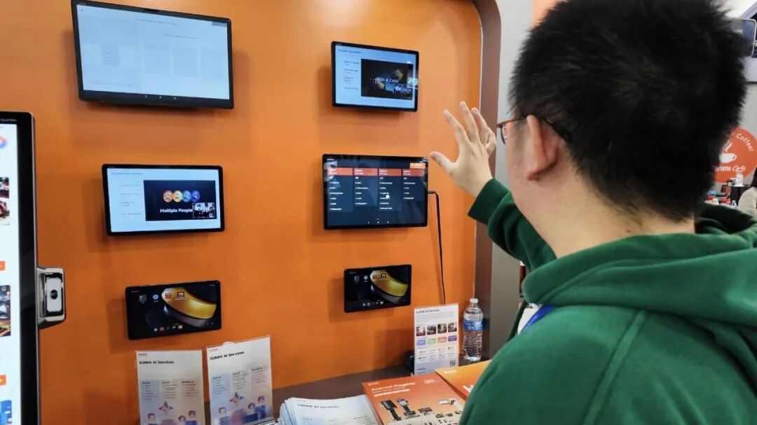 拉斯维加斯 CES 上,一名专业观众对着一台平板隔空点触,屏幕上的订单状态很快切换。这是商米展台的工作人员在为观众演示其餐厅后厨快速出餐的手势操作功能。