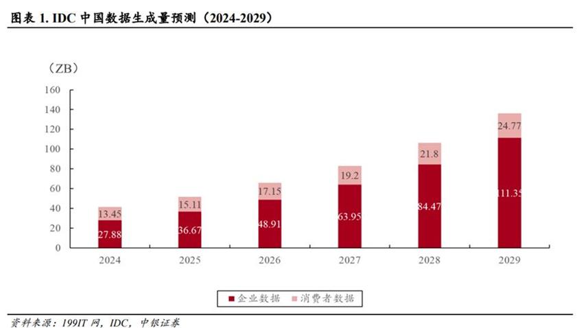 其中,2025年全球数据生成量预计为213.56ZB,到2029年将翻倍增长至527.47ZB。中国2025年数据生成量约为51.78ZB,到2029年或将增至136.12ZB,复合年增长率高达26.9%。
