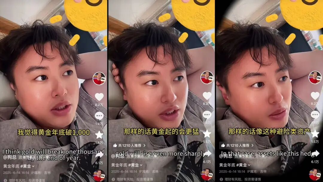 2025年6月,抖音财经博主@狗总 发布一条视频,劝用户“可以的话去买些黄金吧,年底破1000应该是没有问题的”,并从经济、政治环境等角度阐述了这种避险类资产巨大的上升空间。时隔半年,黄金价格的迅猛上涨印证了他当初的猜测,@狗总 也由此受到了越来越多用户的关注。