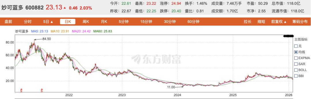 东方财富网数据显示,妙可蓝多股价自2021年冲上最高点之后便一路下行,截止1月29日,妙可蓝多股价报收于23.13元/股,总市值118亿元,不复往昔荣光。