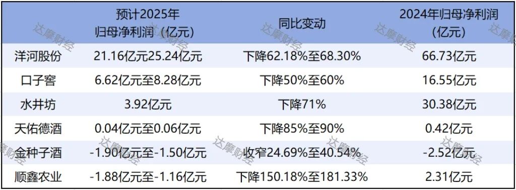 随着A股业绩预告时限将至,上市公司正密集披露业绩预告。A股白酒企业中,已有洋河股份(002304.SZ)、口子窖(603589.SH)、水井坊(600779.SH)等6家白酒上市公司发布了2025年业绩预告,占总公司数的三分之一。其中5家利润下滑超50%,1家继续亏损。