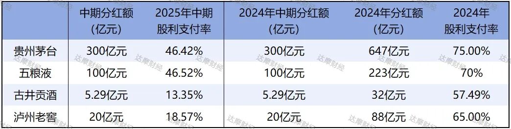 目前,A股上市酒企中,有4家酒企发放了2025年中期股利,包括贵州茅台、五粮液、古井贡酒、泸州老窖。这4家酒企的中期分红额均与上年同期金额持平,尚未出现下调分红额的情况。