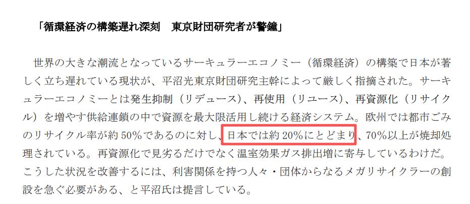 东京财团研究主干平沼光严肃指出,在循环经济(Circular Economy)构建的全球大趋势方面,日本已显著落后。