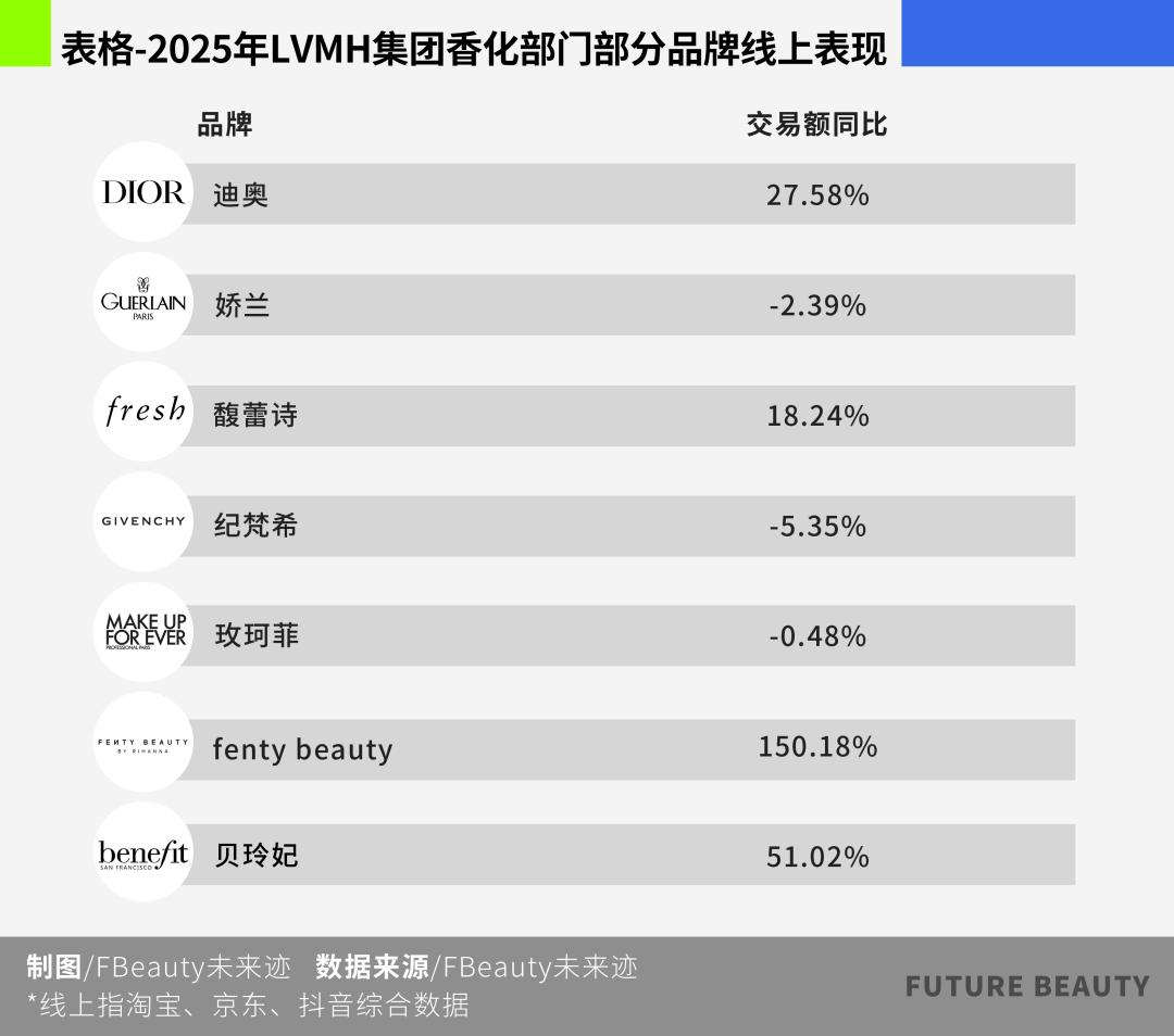 一方面,Dior彩妆、香氛与护肤,以及LV全新上线的香水彩妆等,凭借强新品节奏、强内容表达与品牌势能,仍能在声量与销售上增长。