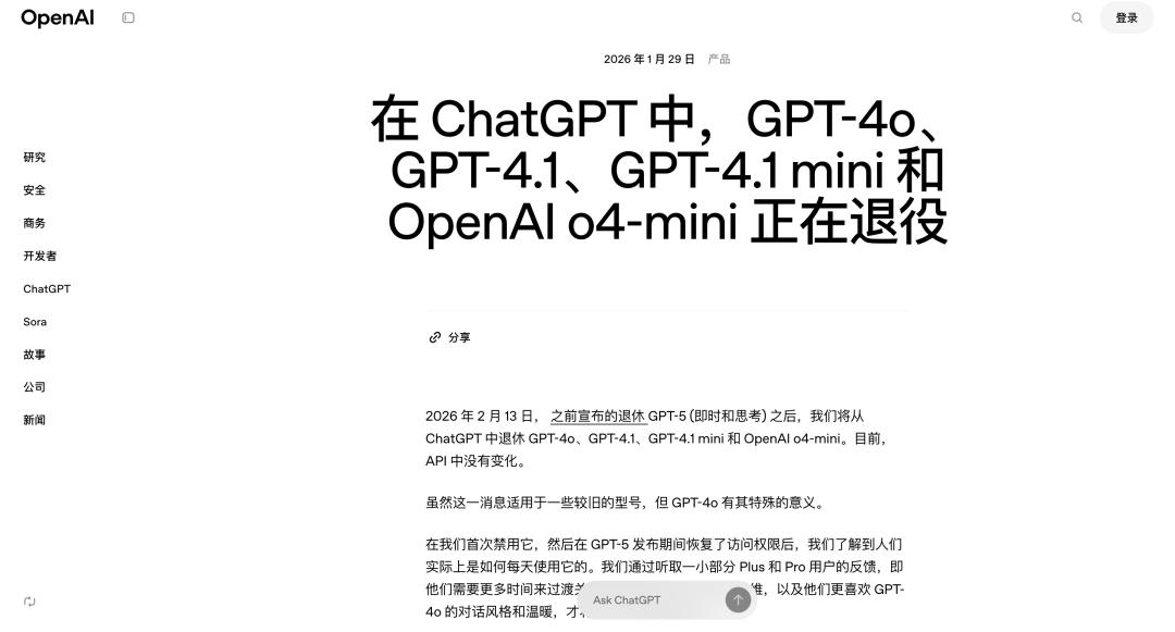 就在刚刚,OpenAI 宣布将在当地时间 2 月 13 日正式从 ChatGPT 中下线 GPT-4o 等多个旧版模型。