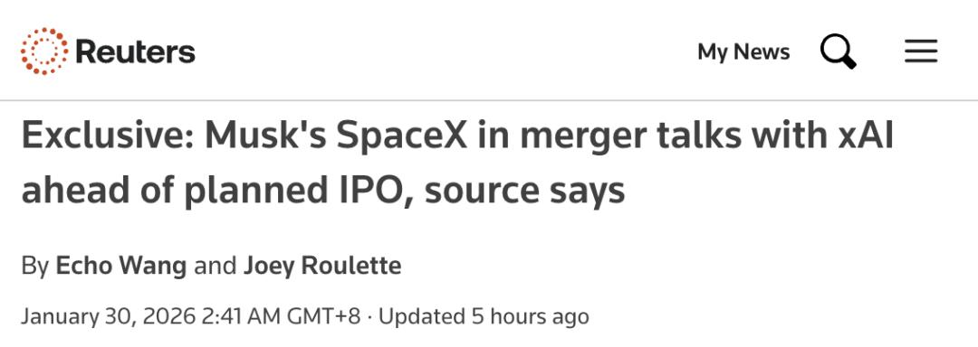 参考链接:https://www.reuters.com/world/musks-spacex-merger-talks-with-xai-ahead-planned-ipo-source-says-2026-01-29/