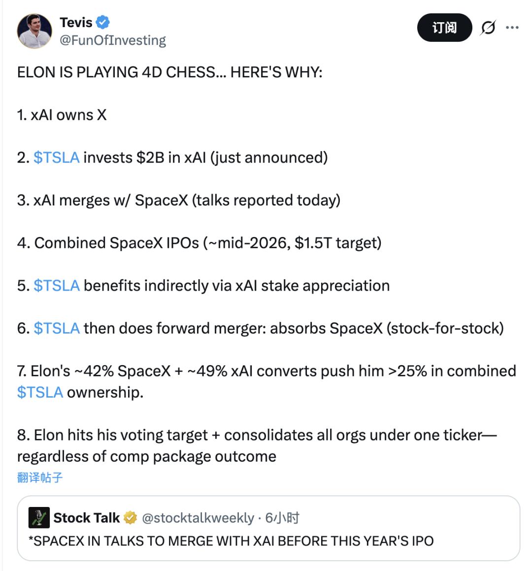 正如这位网友评论的那样,马斯克正在下一盘“4D大棋”,其终局是将所有组织整合到一个股票代码之下,从而达成他对整个商业帝国的绝对控制。