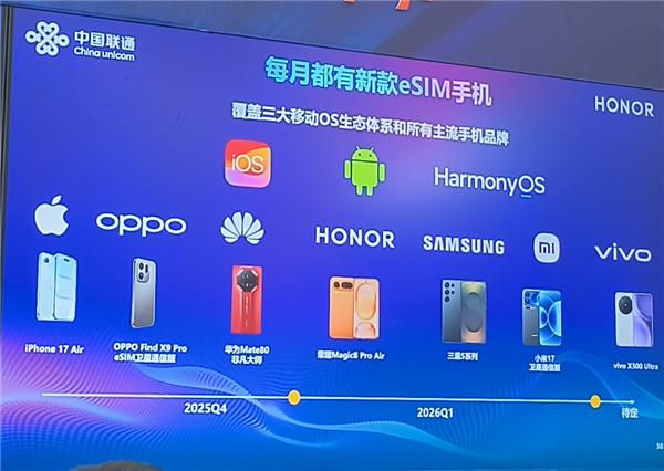 从中国联通发布的路线图来看,今年已经确定会上线支持eSIM的新机包括三星Galaxy S26系列、小米17卫星通信版、vivo X300 Ultra。加上2026年首款发布并开售的荣耀Magic8 Pro Air,目前支持eSIM的新机已经确定至少有4台。