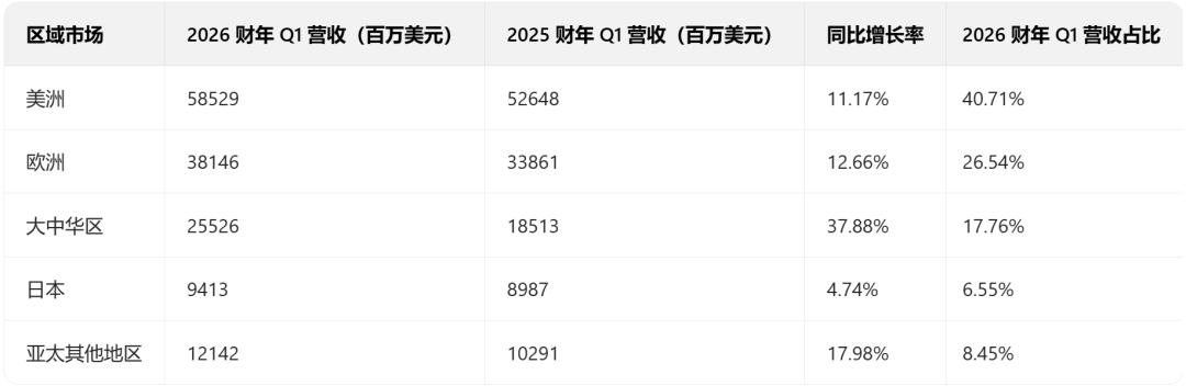▲苹果2026财年一季度各区域市场营收及同比情况,数据来源:苹果财报