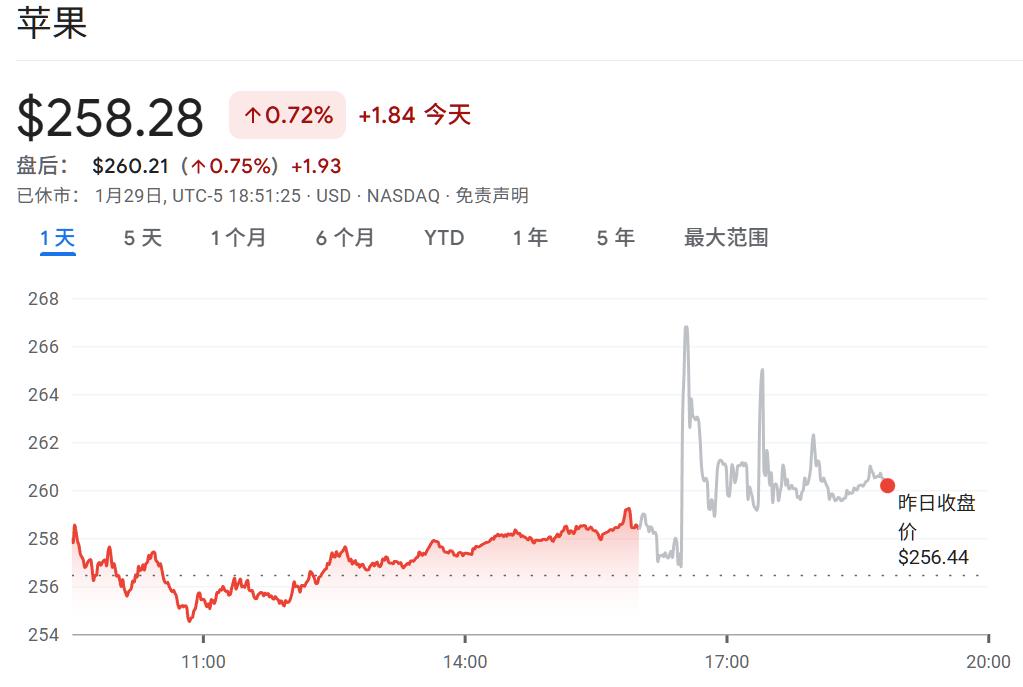 苹果财报发布后,股价一度上涨3%,截至昨日美股收盘,苹果股价小幅上涨0.7%。