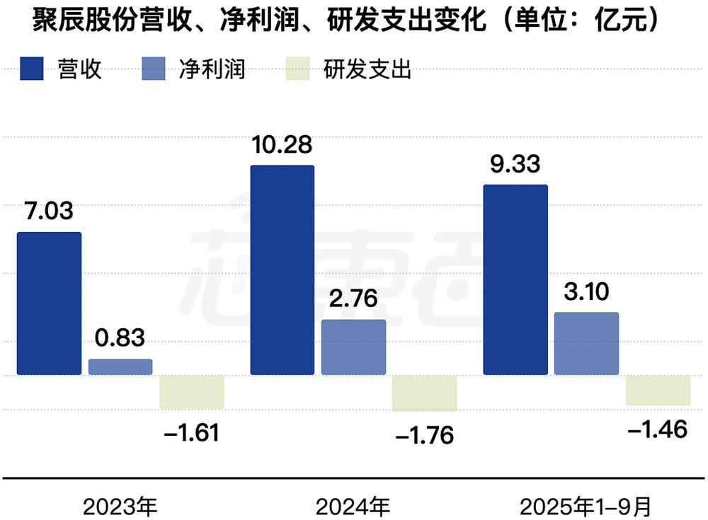 2023年、2024年、2025年1-9月,聚辰股份收入分别为7.03亿元、10.28亿元、9.33亿元,净利润分别为0.83亿元、2.76亿元、3.10亿元,研发费用分别为1.61亿元、1.76亿元、1.46亿元,毛利率分别为46.6%、54.8%、59.8%。