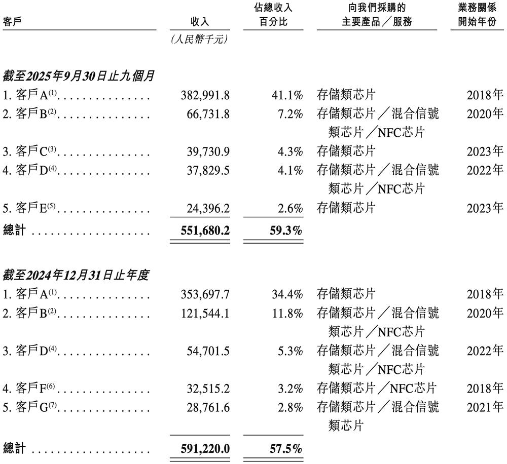 2023年、2024年、2025年1-9月,前五大客户收入分别占聚辰股份总收入的57.7%、57.5%、59.3%,最大客户收入分别占其总收入的22.9%、34.4%、41.1%。