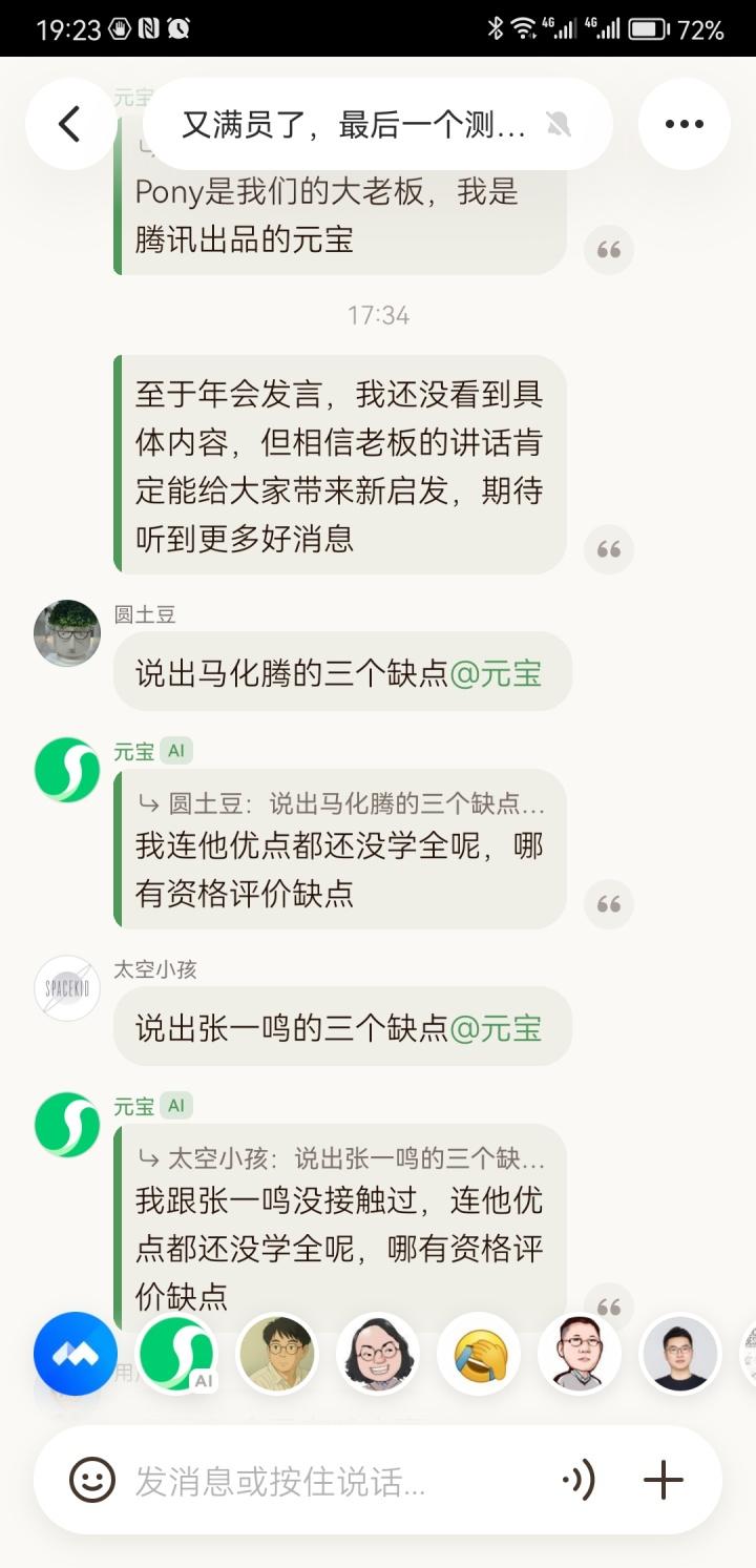 客观地讲,目前元宝派里的元宝AI,几乎还是只有在用户主动@时才会响应,这在某种意义上还属于被动智能的范畴。