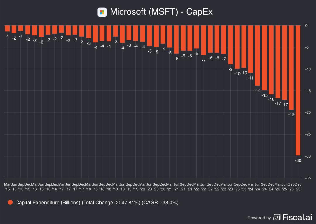 OpenAI 需要更多的钱,但已经投进去的巨头当中开始有人坐不住了。以微软为例,其最新财报显示云计算 45% 的积压订单来自 OpenAI。但与此同时,微软的资本支出增幅高达 89%,完全突破了最近 10 年以来的 CAPEX 曲线。
