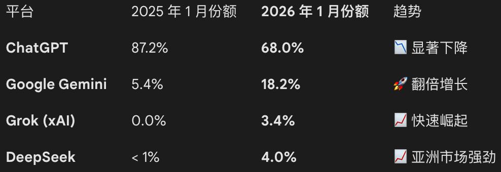 虽然 ChatGPT 在 2025 年曾一度凭借网页端超过 80% 的流量(数据源自 Visual Capitalist)建立起接近垄断的优势,但到了 2026 年初,这种优势正在被迅速蚕食。