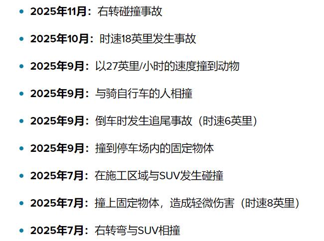 据electrek报道,NHTSA同样对特斯拉进行了调查,发现在2025年7月~11月之间,特斯拉已经在得州报告了9起Robotaxi事故:
