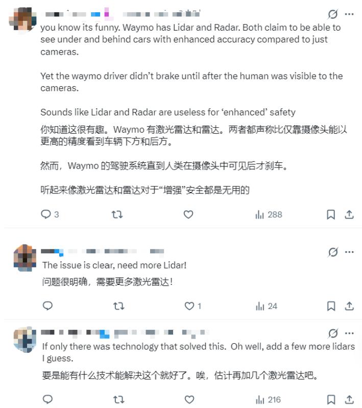 更有人对此事故疑惑,激光雷达或雷达看起来并没有起到作用,应该加装更多: