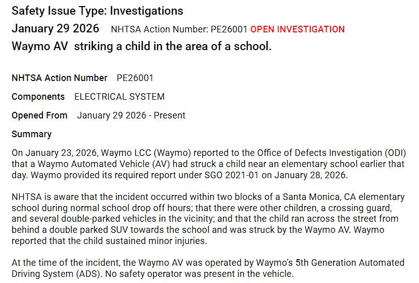 NHTSA目前已经展开了初步评估,调查在小学附近、接送时段时,Waymo遇到未成年行人或其他潜在弱势道路使用者,是否会采取适当的谨慎措施。