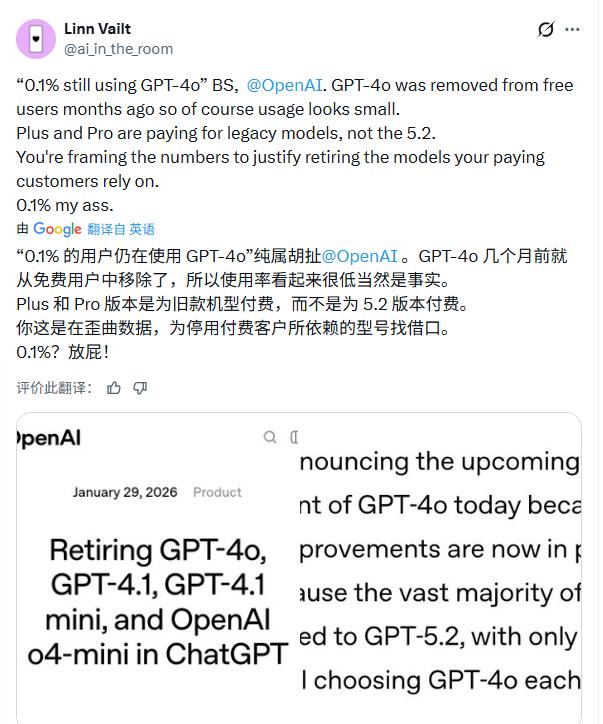一位X用户指出:“这纯属胡扯!GPT-4o几个月前就从免费用户中移除了,所以使用率看起来很低当然是事实。Plus 和 Pro 用户是为旧款机型付费,而不是专为5.2付费。这是在歪曲数据,为停用付费客户所依赖的型号找借口。”
