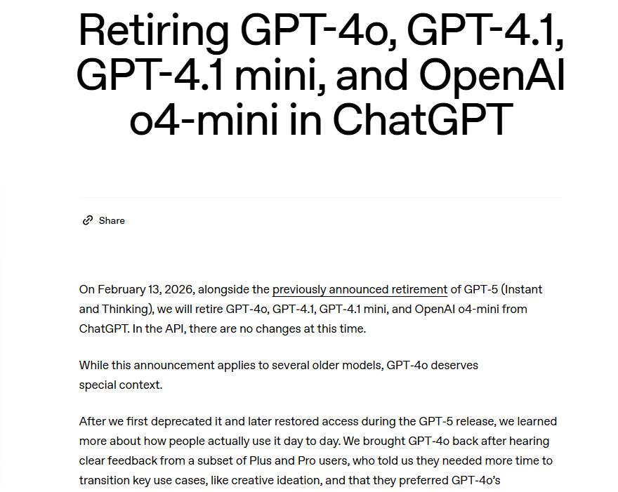 1月30日,OpenAI通过官网官宣,将在2月13日(情人节前1天),正式从ChatGPT中退役经典大模型GPT-4o,距离它上次被短暂下架后又因用户抗议而回归,仅仅过去了半年时间。