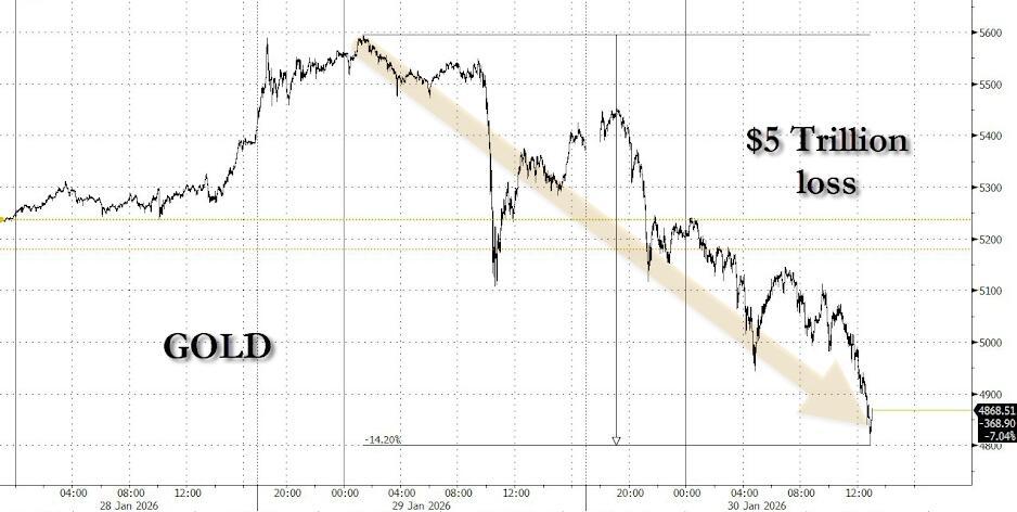 这两条重磅消息叠加,引发市场剧烈波动。美元指数单日暴涨0.9%,创近八个月最大涨幅。曾经被视为避险王者的贵金属遭遇“踩踏式”下跌:黄金一度重回4900美元下方,白银日内跌幅甚至一度超过30%。