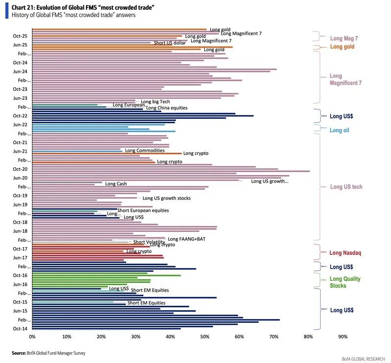 美国银行1月份的基金经理调查明确显示,做多黄金已成为全球市场中最为拥挤的交易。在情绪亢奋时,人人都视其为心头好;但在市场进入去杠杆进程时,这种极致拥挤的资产必然会成为第一个被止盈抛弃的对象。