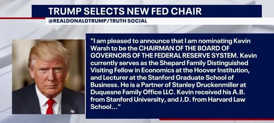 美东时间1月30日周五,特朗普通过社交平台正式宣布,他将提名凯文·沃什(Kevin Warsh)为下一任美联储主席人选,接替任期将于2026年5月届满的鲍威尔。特朗普在帖文中称沃什是“备受尊敬、不会让人失望”的人选。