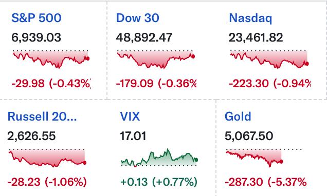 与之形成鲜明对照的是,美股主要指数虽承压但表现有序,跌幅相对温和。标普500下跌约0.4%,纳指跌近1%,而对利率敏感的小盘股表现更弱,罗素2000跌幅约1.5%。