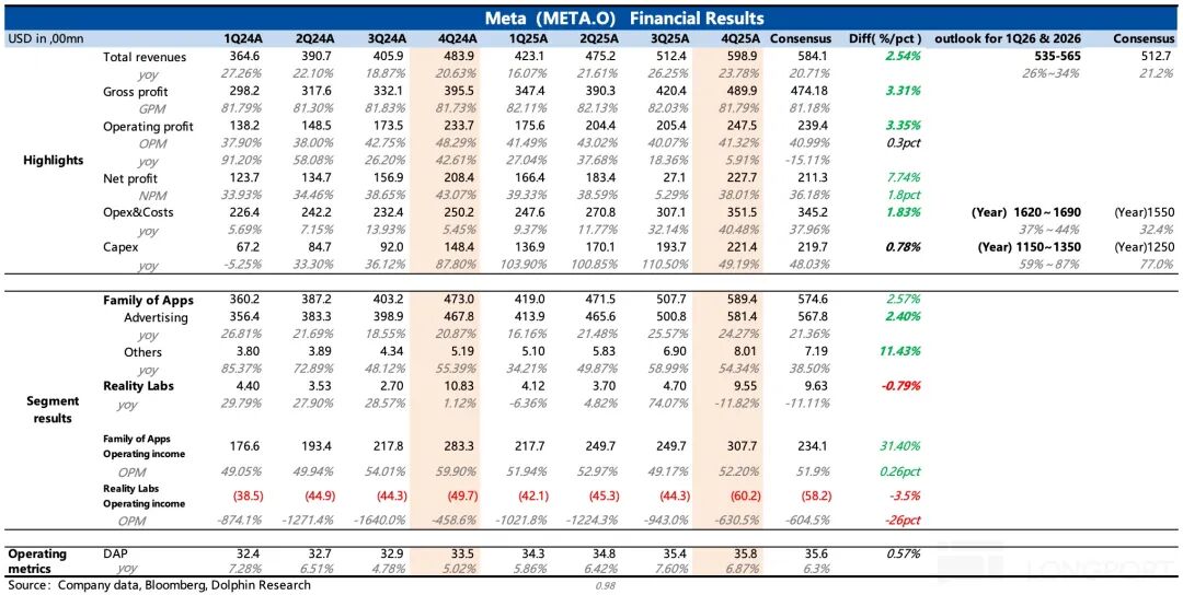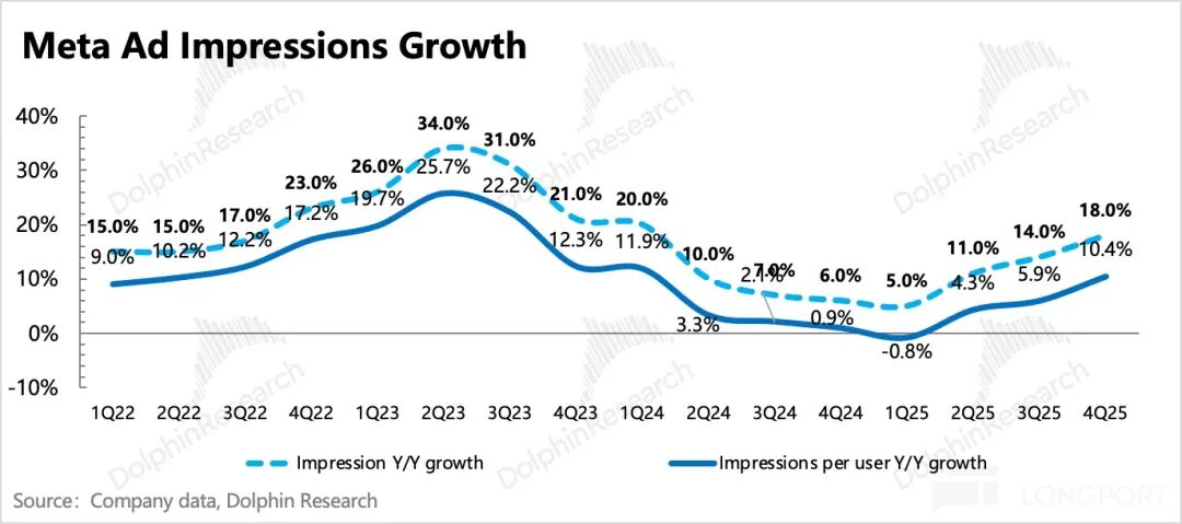 Q1的收入指引:Meta管理层预计1Q26总营收535-565亿区间,对应变动为同比增长27%~34%,其中汇率有4pct 的顺风。这一指引明显高于卖方一致预期515亿,从指引趋势上来,按照管理层一贯保守的画风,Q1增速有望稳在30%以上。