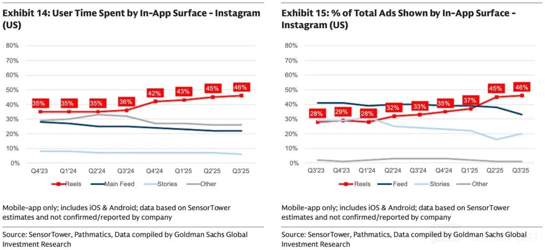 广告强势的驱动力主要就是Reels和AI,从量价变化趋势也能看出,短视频天然增加库存,但单价更低,因此把综合CPM的增速拉了下来。在AI带来的内容推荐算法优化后,本身就具备沉浸感的Reels 直接成为脱缰的野马,显著增加了用户粘性和时长,大幅增加广告库存和提高转化效率。