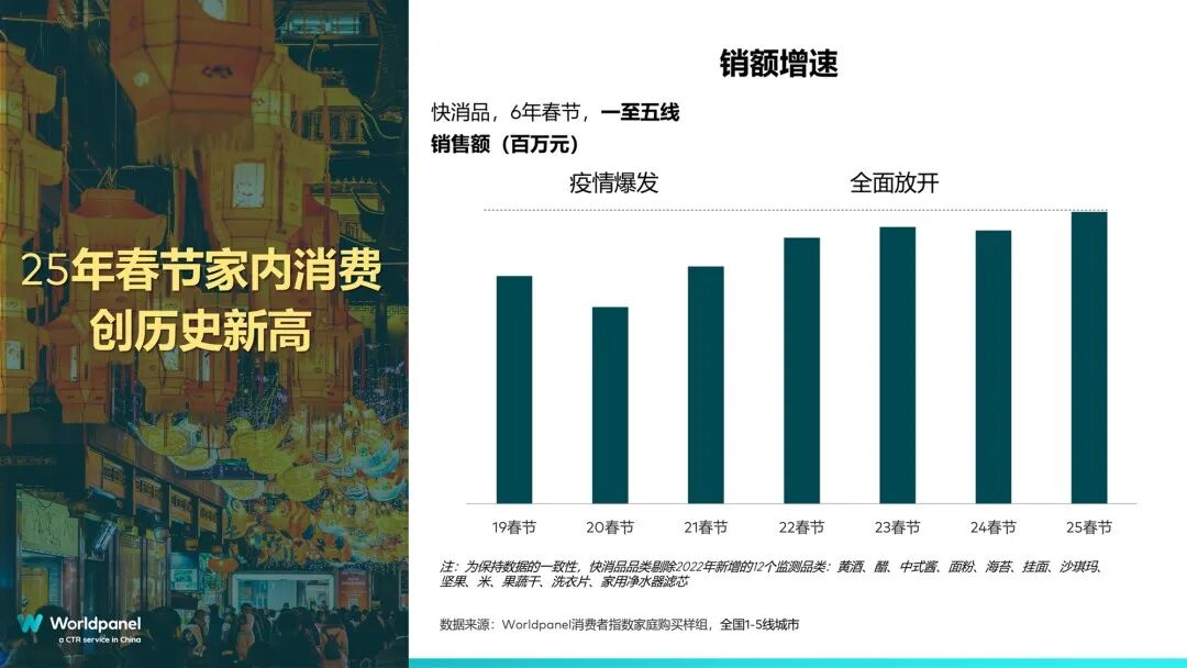 尤其是快速消费品市场,Worldpanel消费者指数显示,2024年行业约20%的销售额发生在春节期间,2025年的春节期间销售额创近6年来历史新高。2025年前三季度,我国快速消费品市场销售额同比增长1.3%,为2026年春节消费增长埋下了一个伏笔。