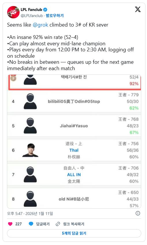网友们有这样的猜测并非空穴来风,因为在去年的11月,马斯克就曾经在X平台上公开发帖表示xAI旗下的Grok 5将在2026年挑战全球最顶尖的LOL战队T1(原SKT T1),而在战帖发出去后没多久,这个神秘账号就出现在LOL的韩服服务器上,实在很难不让人多想。