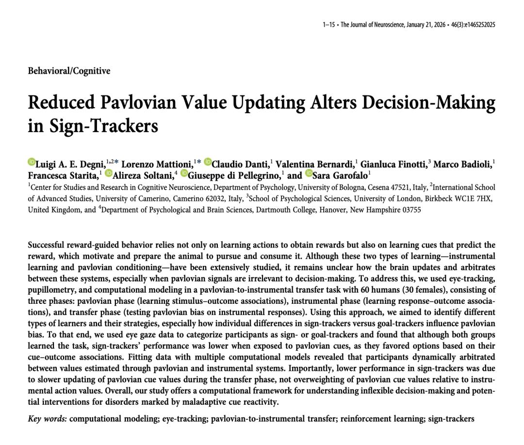 参考文献:Degni, L. A., Mattioni, L., Danti, C., Bernardi, V., Finotti, G., Badioli, M., ... & Garofalo, S. (2026). Reduced Pavlovian value updating alters decision-making in sign-trackers. Journal of Neuroscience, 46(3).