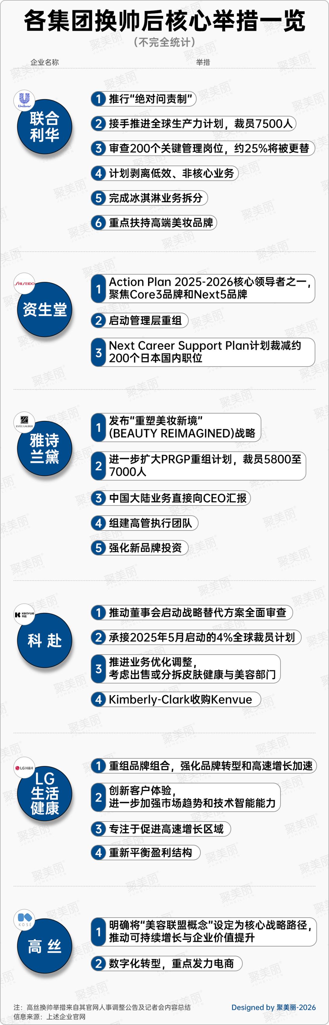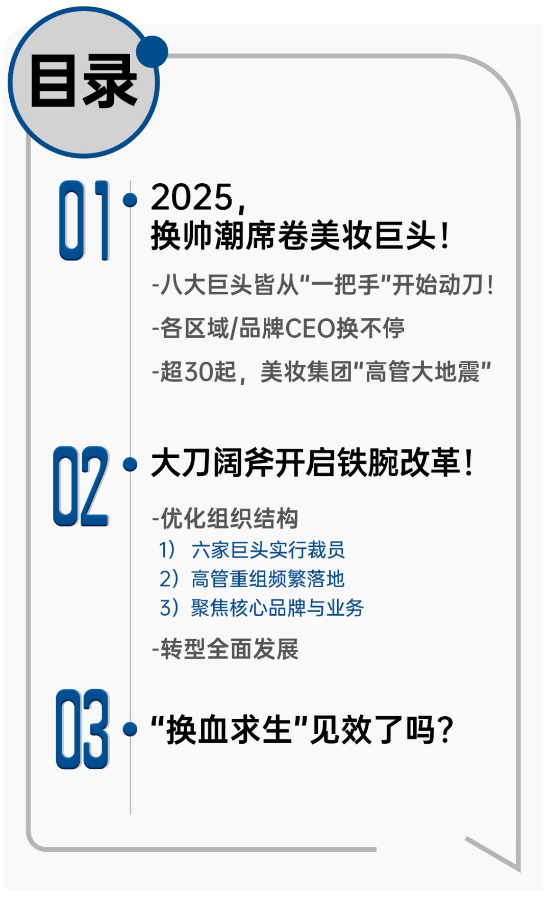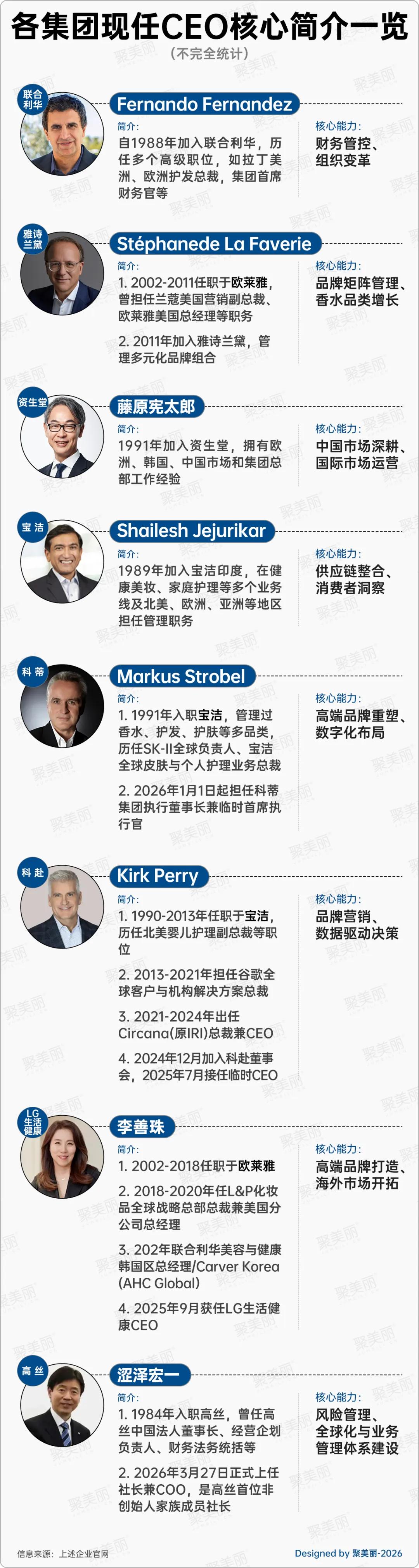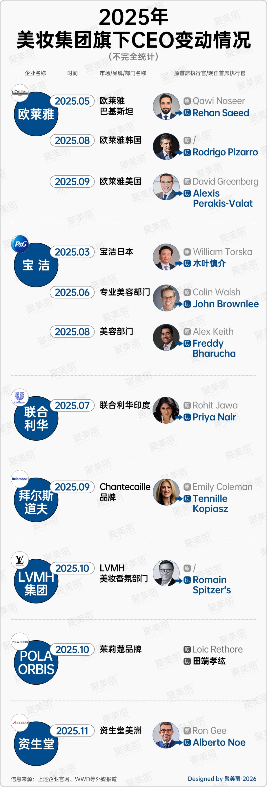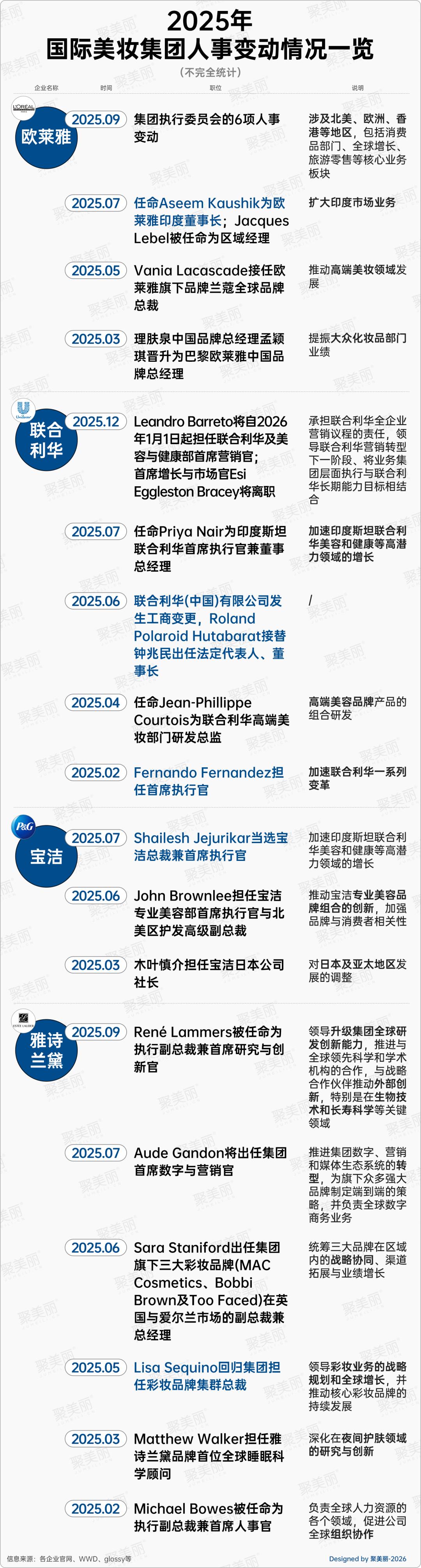 据聚美丽不完全统计,2025年,仅全球头部美妆集团的高管变动就发生了超30起,其中八大美妆巨头均经历了集团“一把手”的更迭。