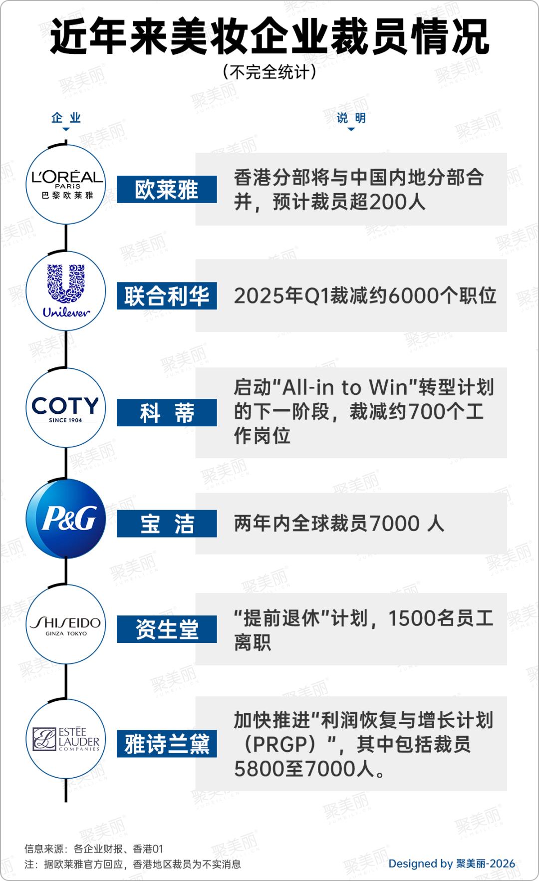 比难还难的2025年,“裁员”成为了各个企业的主旋律。如下图所示,全球美妆巨头中六家实行裁员。