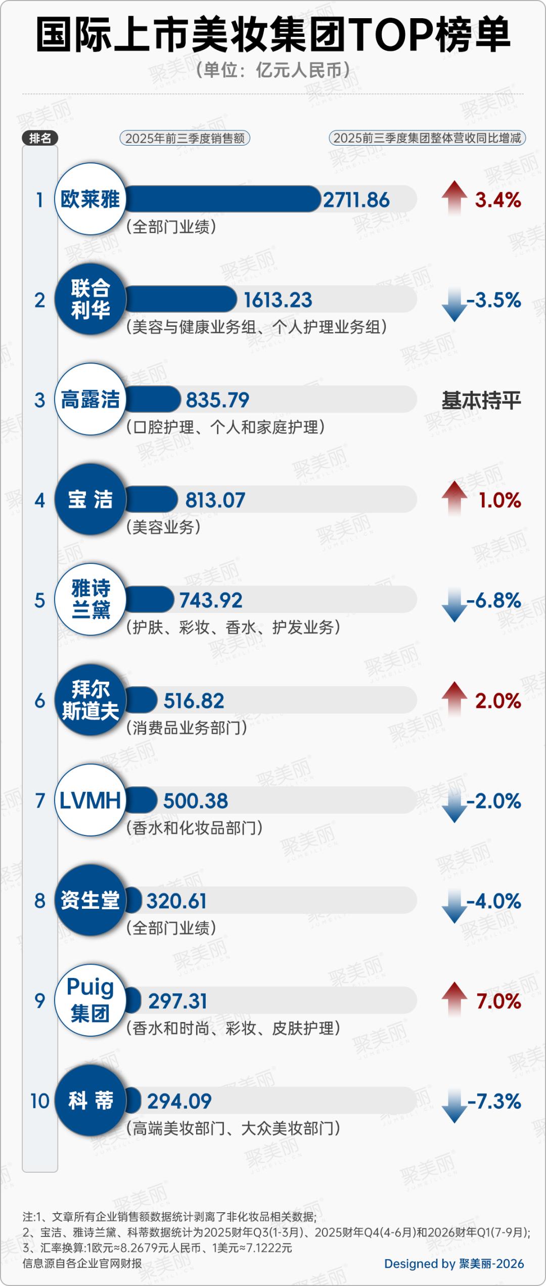 行业整体业绩增速明显放缓,市场表现疲软,不少企业甚至出现营收下滑,头部企业之间的位次争夺战愈发激烈。在国际TOP10美妆企业中,半数集团整体营收回落,即使保持增长者也只是幅度有限。