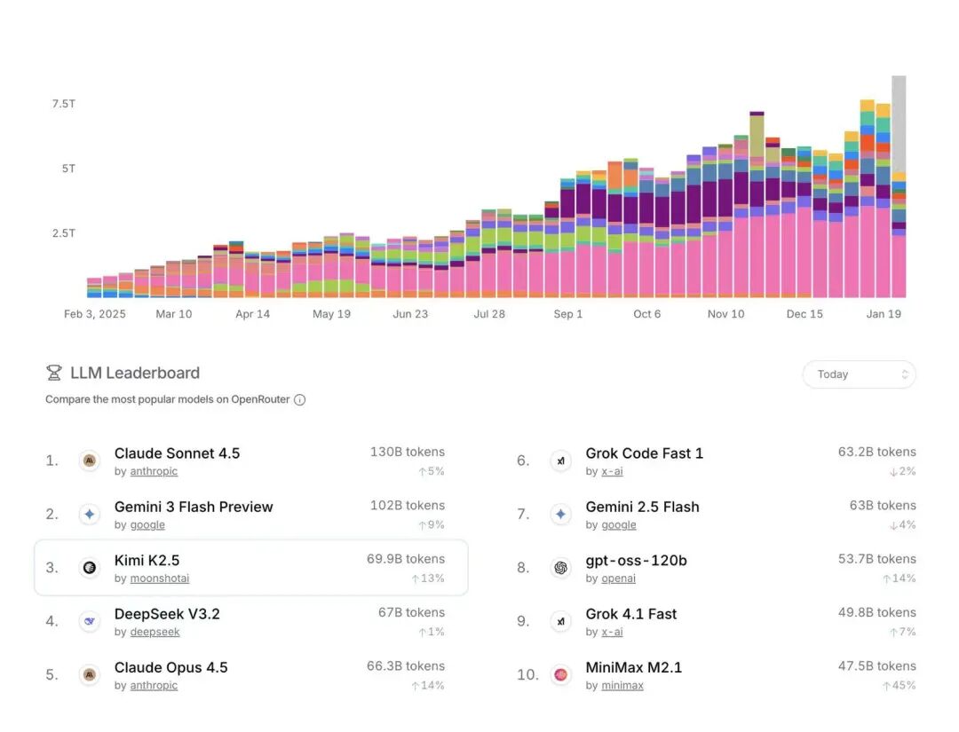 继上一代模型K2发布会后,K2.5继续引发了海外热潮。在Openrouter上,K2.5的排名已经来到第三位,仅次于Claude Sonnet 4.5和Gemini 3 Flash。
