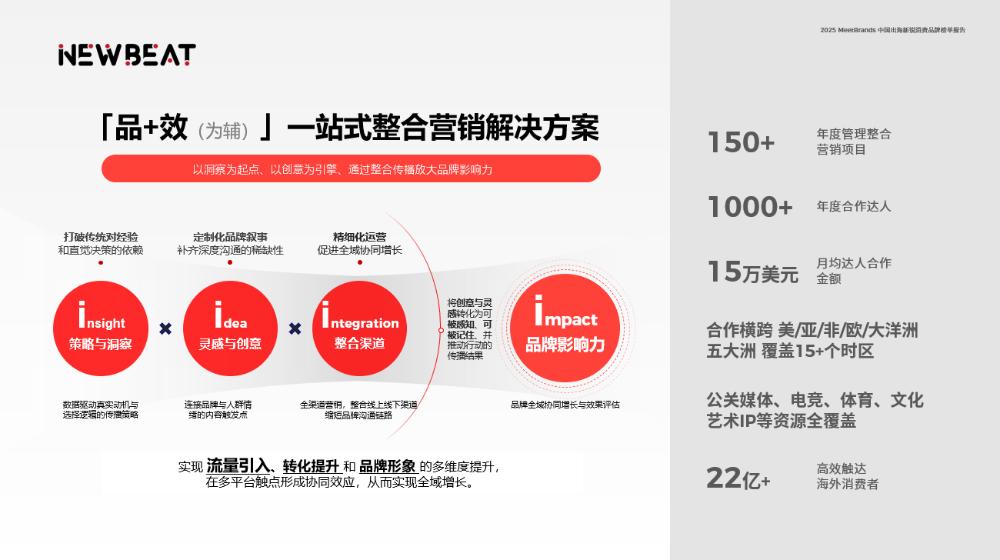 针对这些难点,BeyondClick旗下的整合营销厂牌NewBeat能通过以市场策略为牵引的整合营销能力,帮助品牌统一核心叙事,在不同渠道与地区协同内容、创意与投放节奏,降低认知偏差与沟通成本,让品牌价值更高效地沉淀到消费者心智中,实现从被看到到被记住的一站式突破。