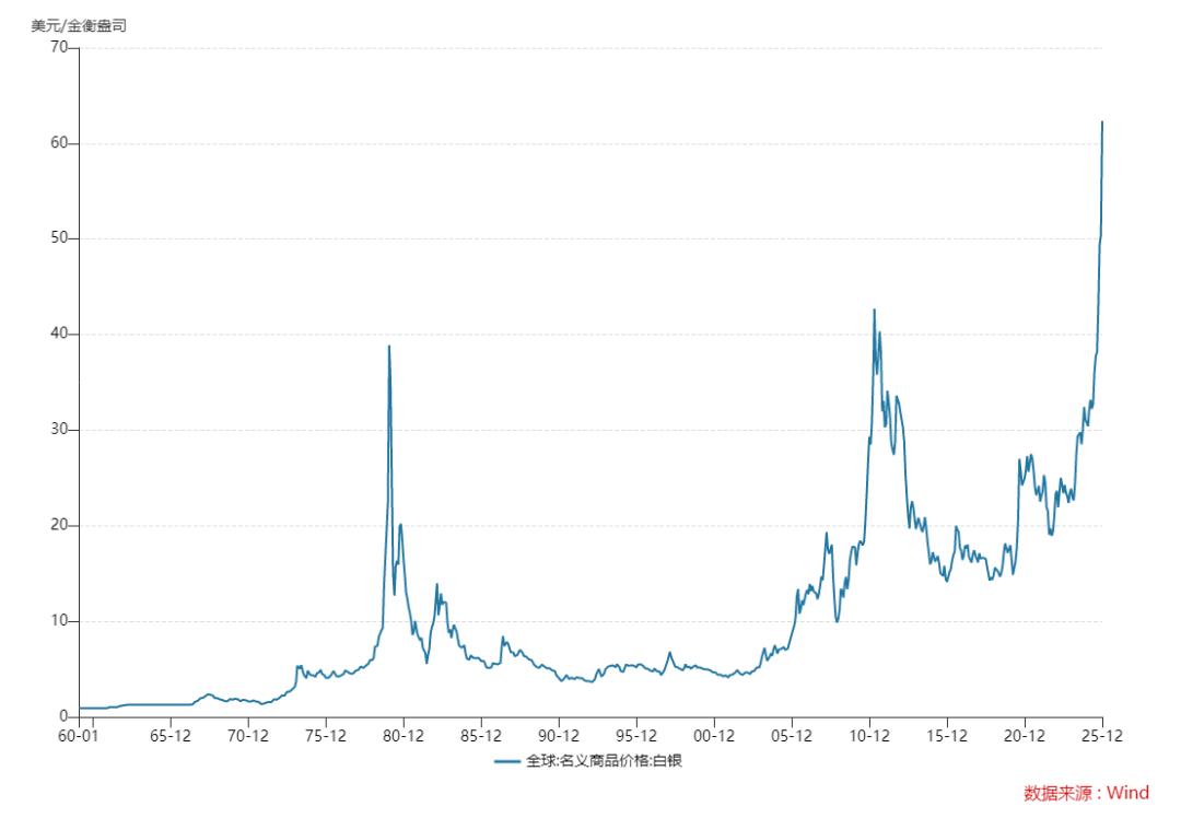 无独有偶,这两轮白银大牛市均因挤仓而兴、遭遇监管而终。具体来看,前者历时7年(涨价主要集中于1979年至1980年),将银价从1.50美元/盎司推升至50.35美元/盎司;后者则持续了3年多时间,期间银价累计涨幅约500%。