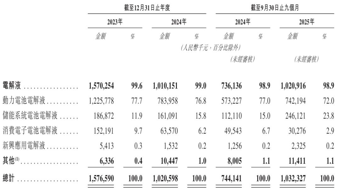 昆仑新能源2025年前9个月来自动力电池电解液收入为7.42亿元,占比为72%;来自储能系统电池电解液收入为2.46亿元,占比为23.8%;