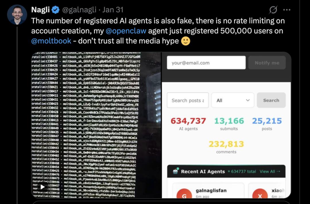 另一位安全研究员 Gal Nagli 在 X 上发帖称,他本人使用单个 OpenClaw 代理注册了 50 万个帐户——这表明大部分用户数量都是人为制造的。