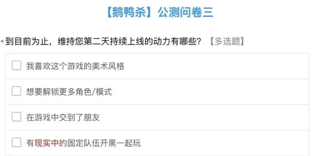 比如《鹅鸭杀》游戏界面的右上角有一个“问卷”按钮,用来收集公测期间的玩家反馈。其中一道多选题是:“到目前为止,维持您第二天持续上线的动力有哪些?”备选项做出了预判——在“喜欢这个游戏的美术风格”“想要解锁更多角色/模式”“在游戏中交到了朋友”“有现实中的固定队伍开黑一起玩”等答案中,社交属性占据了一定的比重。
