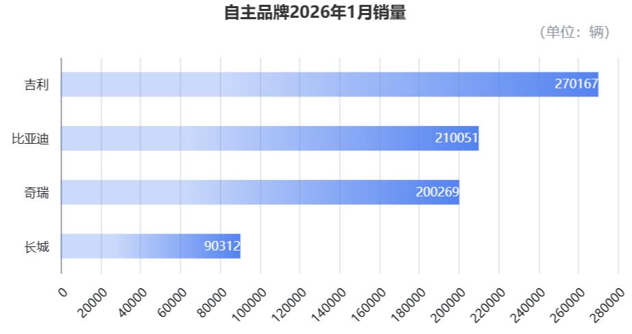 吉利以27万台的月销量登顶,同比增长1%;之前的“一哥”比亚迪易位,1月销售21万台,同比下滑30.11%。